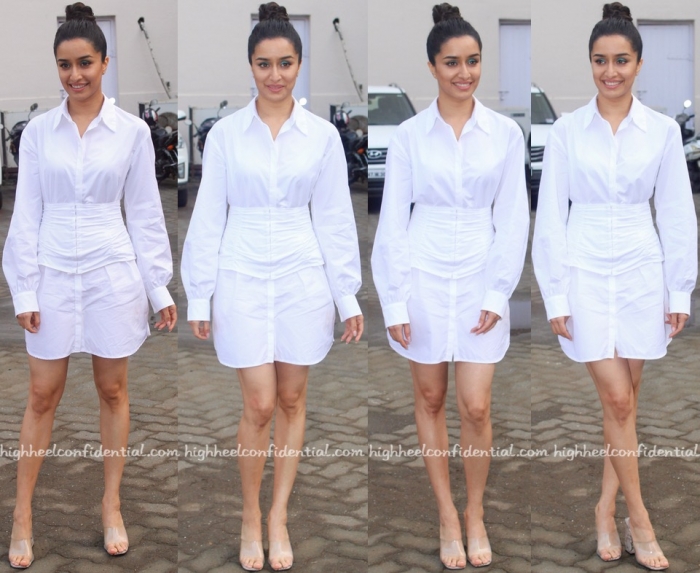 Latest round of movie promotions had Shraddha wearing Danielle Guizio. With her hair in a top knot, she rounded out the look with dramatic eye make-up and a pair of clear slides. She wore the look well.