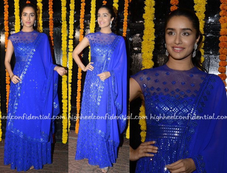 Shraddha picked an Abu Jani Sandeep Khosla suit to wear to Ekta Kapoor’s Diwali bash pairing it with diamond drop earrings. As much as I love the color of the suit, I wish she’d added a berry lip here. Her face looked washed out against the rich suit. Agree?