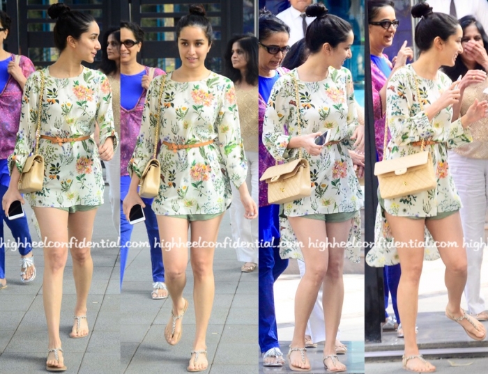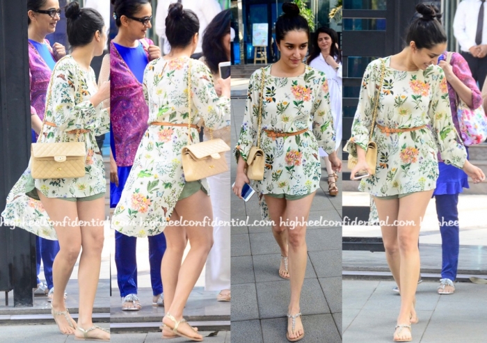 While out and about in Mumbai, Shraddha was spotted wearing a signature Payal Singhal high-low floral tunic, one that she teamed with a pair of olive-colored shorts. Adding a belt for some definition, she rounded out the look with a top knot, Chanel bag and thong sandals.