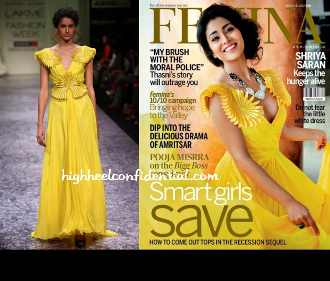 Femina’s Mar cover has Shriya in a yellow Swapnil Shinde gown with pleated shoulder details. Not quite sure if this is a modified version of the runway piece or just worn without the pleated belt detail.