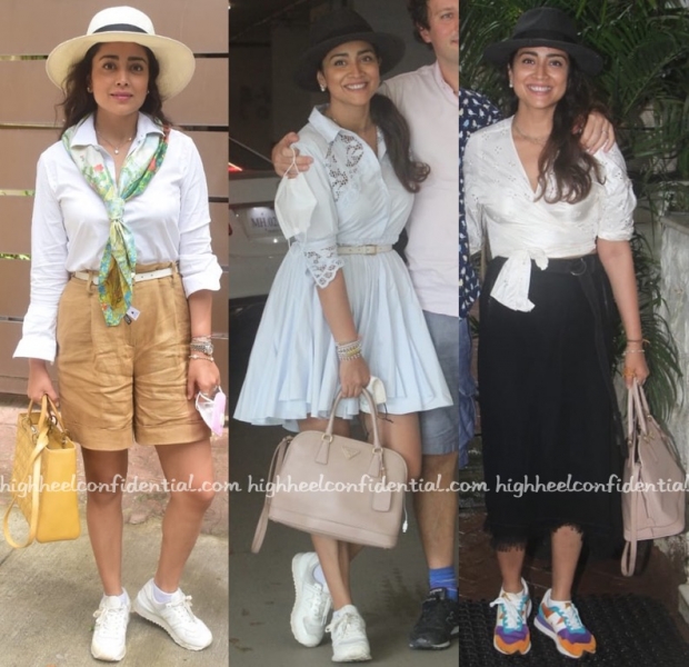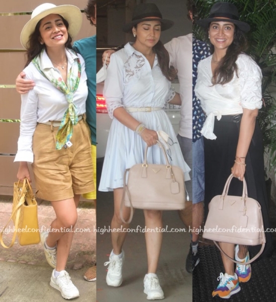 Hats, roomy designer totes and good ol’ sneakers have been Shriya’s go-to accessories while out and about in Mumbai. Think she makes it work?