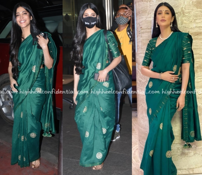 Shruti attended the mahurat ceremony of her next movie in Trivandrum wearing a green sari by Deep Thee and was seen still wearing it while travelling back to Mumbai. She looked lovely in the sari and also brownie points for wearing a color other than black.