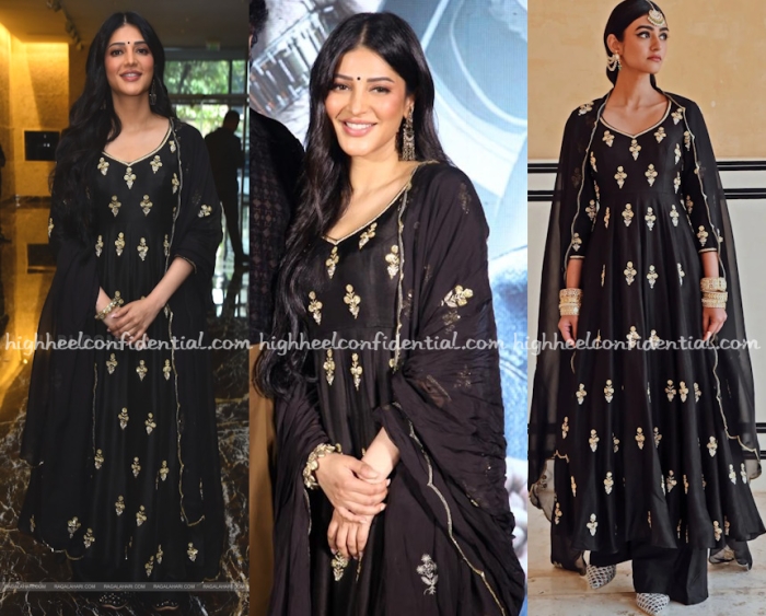 At the pre-release event of her upcoming movie, Shruti was seen in a black kurta set from Ease Studio featuring gold all-over embroidery. I liked the simplicity of this.