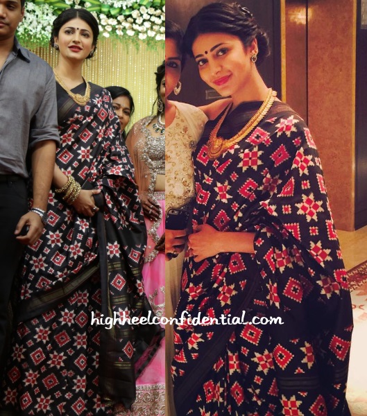 Wearing what seemed like a Gaurang ikat sari, Shruti attended the wedding reception of Tamil actor Shantanu & VJ Keerthi. I wish we had more pics of Ms. Haasan because she looked lovely in this avatar. It’s one we don’t see her very often in and made for quite a sight.