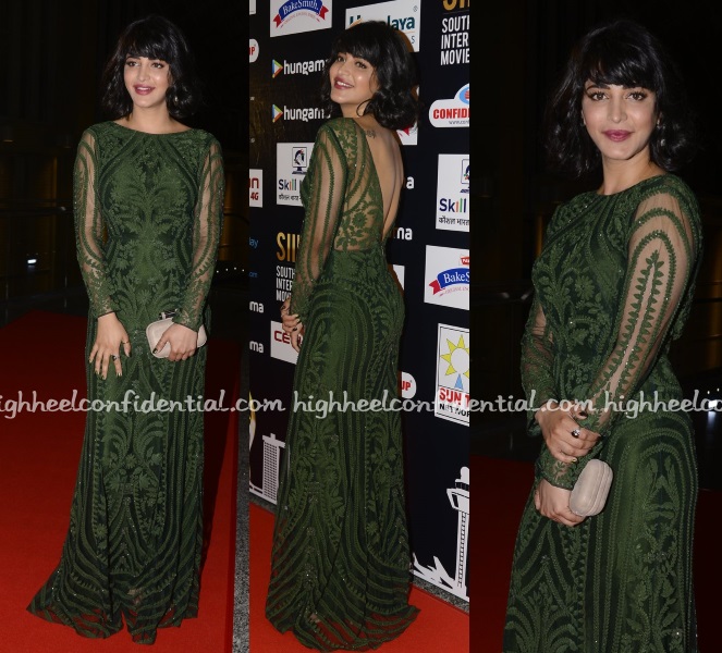 Shruti attended day one of SIIMA festivities wearing an intricate Pankaj and Nidhi gown with a beige clutch. I look at that gown and see so much potential. Unfortunately, because of the hairdo, the overall appearance felt really underwhelming.