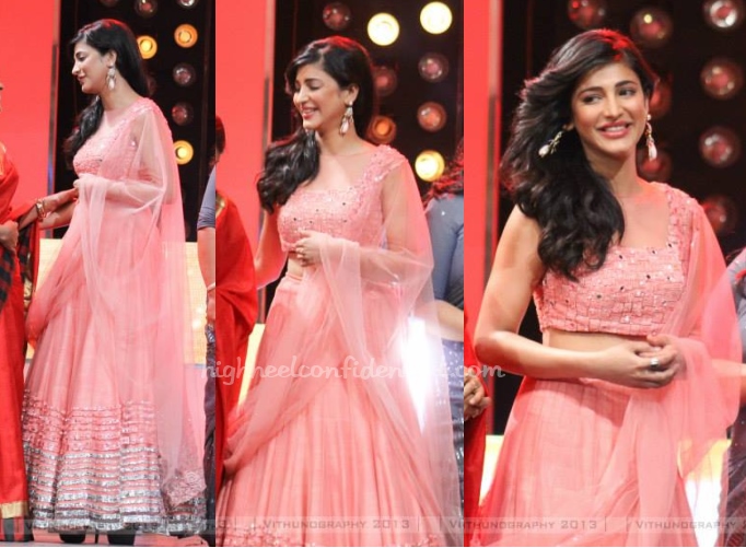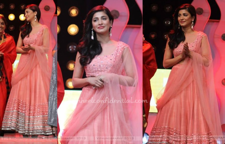Wearing a pink Manish Malhotra gown, Shruti attended the 2014 JFW Achievers Awards on Saturday night in Chennai. The color looked lovely on her and after her last lehenga look, this was quite an improvement.