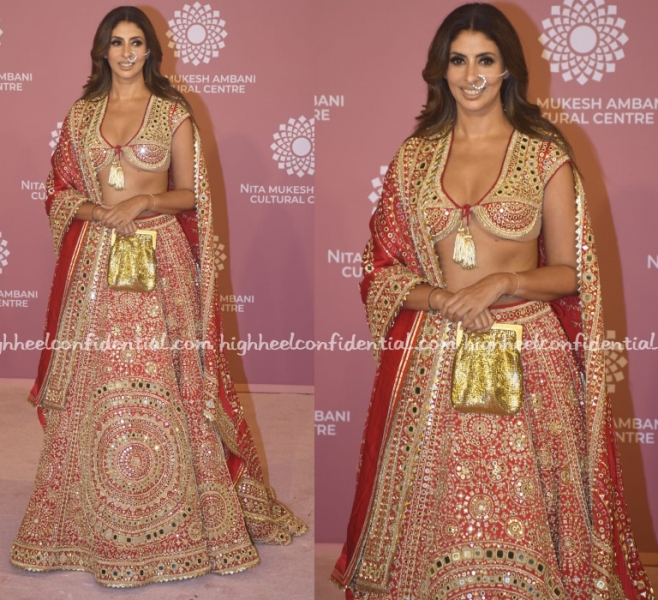 Wearing an Abu Jani Sandeep Khosla lehenga, Shweta attended the NMACC India In Fashion exhibit. Between that sheer panel on the choli that gave the illusion of spillout and the nath addition, all my love that was there for rich embroidery on the skirt went right out the door. How does one decide to step out when something fits so poorly.