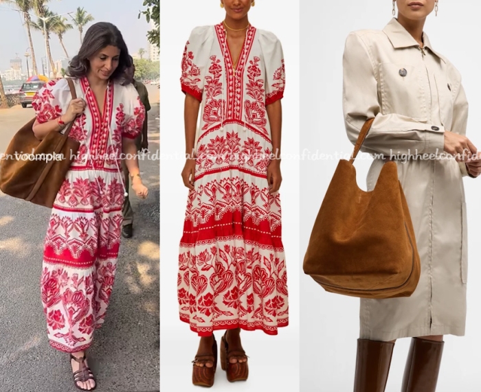 Shweta was seen at Zoya’s Christmas lunch last week wearing a Farm Rio dress paired with sandals and Toteme’s oversized suede bag.