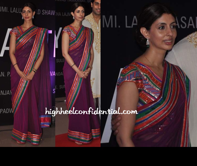 Anyone who said Shweta dresses better than Aish because of Big B’s b-day party, take your words back! She gets it right occasionally,but majority of the time she is a complete disaster like this saree here.Anyone who thinks this is ok get ur eyes checked. There are so many colors. So cheap! There are so many sarees out there, there is no excuse to show up in this especially since you are kind of like a celeb.
