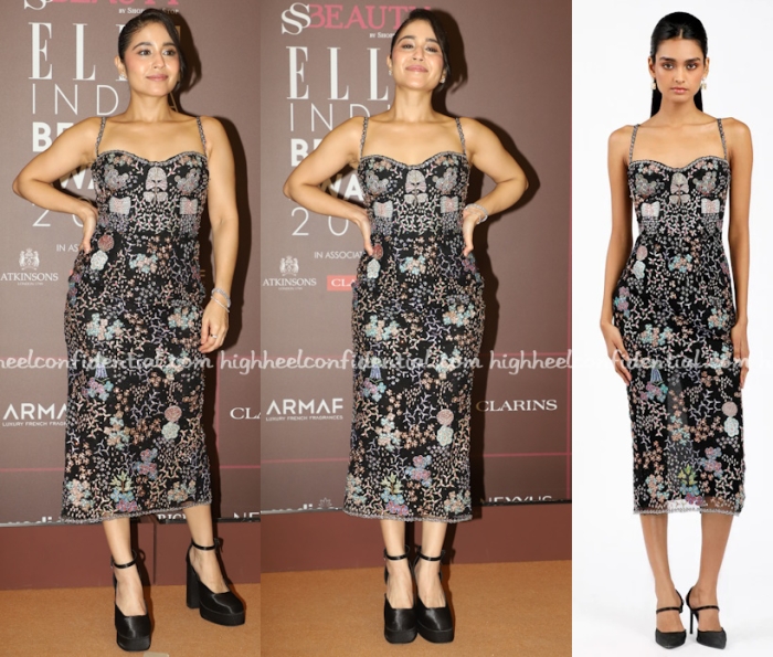Shweta attended a beauty event wearing an embroidered midi dress from Aisha Rao with a sleek updo and platform ankle-strap pumps. Now, did I think the shoes were way too heavy for this dress. Totally. But, it wasn’t a deal breaker either. Overall, she looked good.