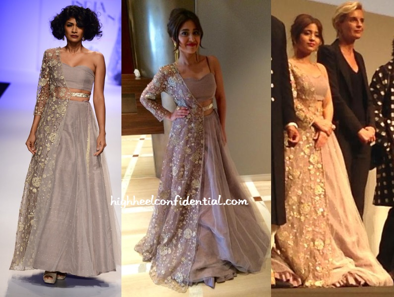Between the odd-belted-half-sleeved-net-thingie/is-that-a-dupatta design and the spaghetti strappy top, I wasn’t feeling much love for the lehenga. Brownie points though for going desi.