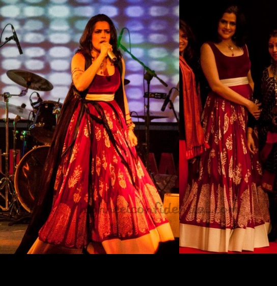 At a recent concert in Delhi, Ms. Mohapatra donned a maroon Rohit Bal gown. A stage outfit needs some amount of drama and you can’t deny this dress is dramatic.