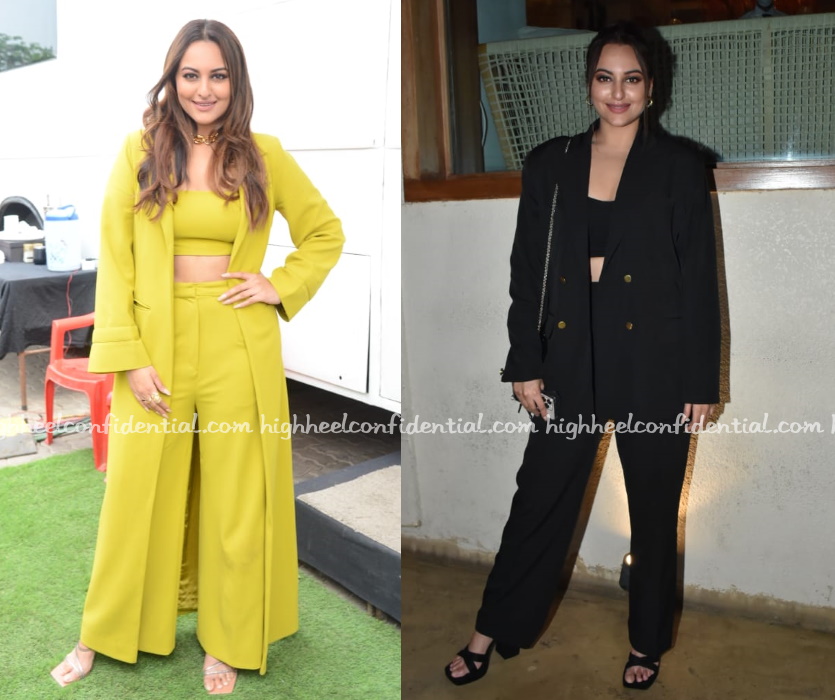 Sonakshi sported pantsuits twice in a day, first to a taping and then to a dinner. Between the two, much preferred the chartreuse one although the footwear could’ve been better. Which one did you like more?
