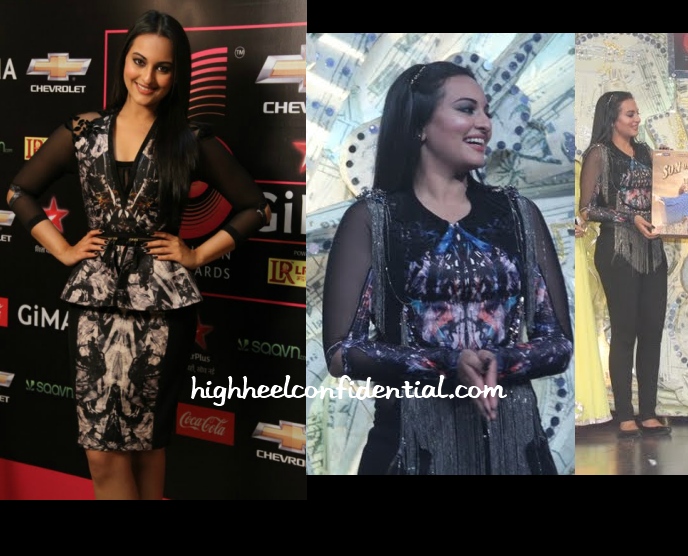 Not only did Sonakshi attend GIMA wearing a Falguni and Shane Peacock, she also performed at the awards wearing a Peacock bodice at the event.