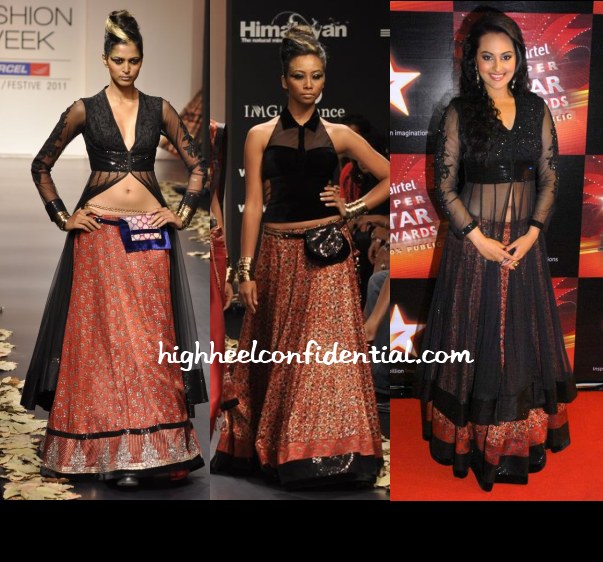 Katrina Kaif carried a similar lehenga by Manish Malhotra (2011 Filmfare awards) much better than Sonakshi. Somehow Sonakshi ends up looking boring despite wearing nice clothes.