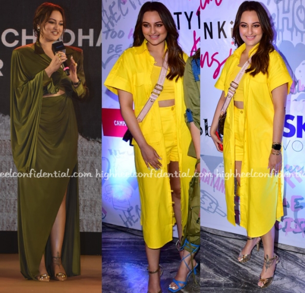 Sonakshi attended the trailer launch of her upcoming series wearing a Deme skirt set. Loved the olive color on her but that part shawl-ey/part structured top was not one that I liked.