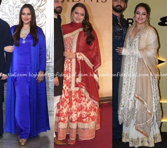 Sonakshi attended two Diwali parties and a fashion show and was seen in a silk top, jacket and pants set from Manish Malhotra, a red Vikram Phadnis floor-length anarkali and then in one from Itrh.