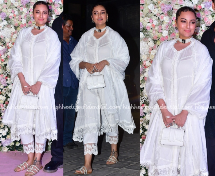 Wearing a kurta set from Roze, Sonakshi attended the Khan-Sharma Eid party on Saturday evening. This particular kurta suit was wasn’t a fav but wearing it with the overly sleek hairdo with that baby hair, the choker and those pearl sandals just made the look so much worse.