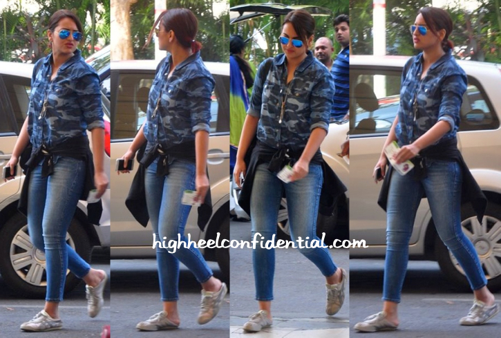 Blue camouflage button-down with cropped denims, slip-on sneakers and mirrored Ray Ban aviators was what Sonakshi was photographed in as she made her way in to the Mumbai airport. Think she did good?