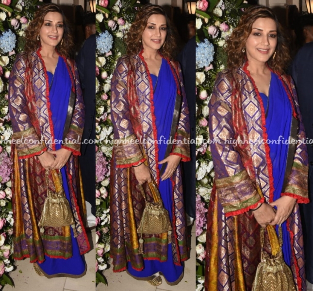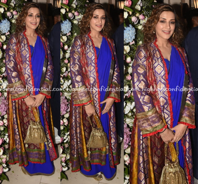 Sonali attended Diwali parties on Saturday wearing a blue sari paired with benarasi long jacket, both from Abu Jani Sandeep Khosla. Am on the fence about this look because I like the idea and that jacket was pretty with its full puffy sleeves made didn’t quite work with the sari. I think if she’d worn the jacket with a simple kurta suit, would’ve been more effective.