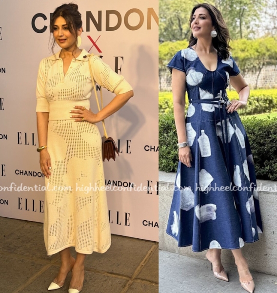 Sonali attended an event today wearing a white knit Lovebirds dress with her Rossi pumps and a shoulder bag. A few months ago, she wore a blue midi dress also from the label with nude mules.