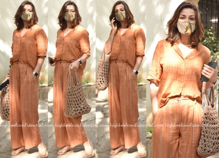 Wearing printed separates with a woven mesh bag and pair of nude sadals/flip-flops, Sonali stepped out in the Mumbai recently. She wears the relaxed, fuss-free separates well; Sonali looked good.