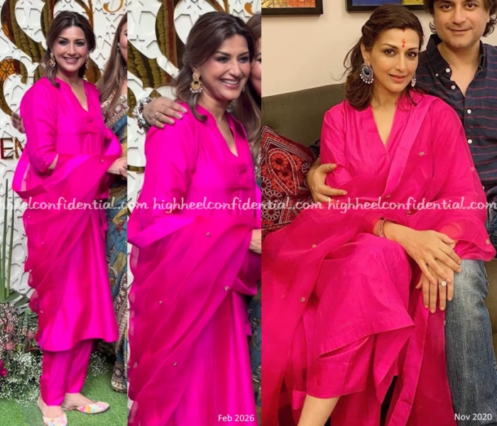 Sonali was seen at a store visit re-wearing her Brih kurta, one that we saw on her back in 2020. It sure is a striking color and she as always looked pretty in it.