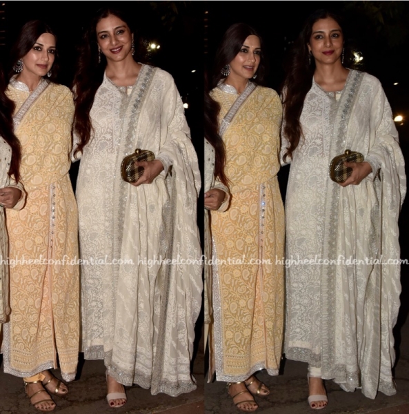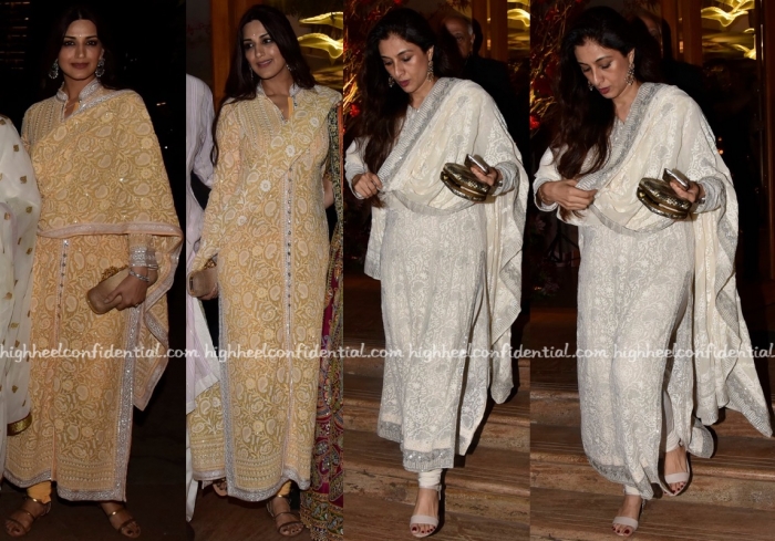 At a recent wedding reception, both Sonali and Tabu were photographed in signature Abu Jani Sandeep Khosla suits. While Sonali rounded out her look with an Alexander McQueen clutch and gold-toned sandals, Tabu rounded out hers with a box clutch and pair of neutral sandals.