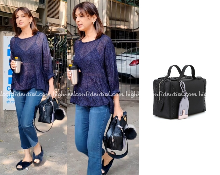 While out and about, Sonali was spotted keeping it casual in denims and furry sandals but what caught my eye was her Tod’s bowling bag which to which she added another Fendi furry bag charm.