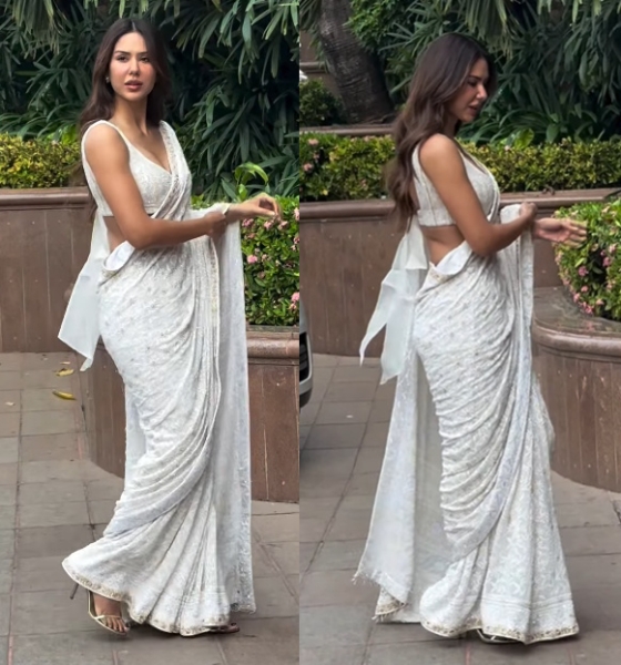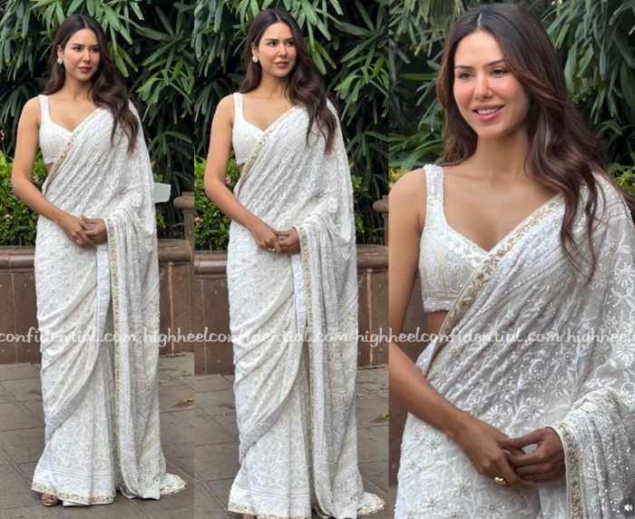 Wearing a chikankari sari, Sonam attended a press meet of her movie. Kundan studs and a ring finished out her look. She looked lovely in it.