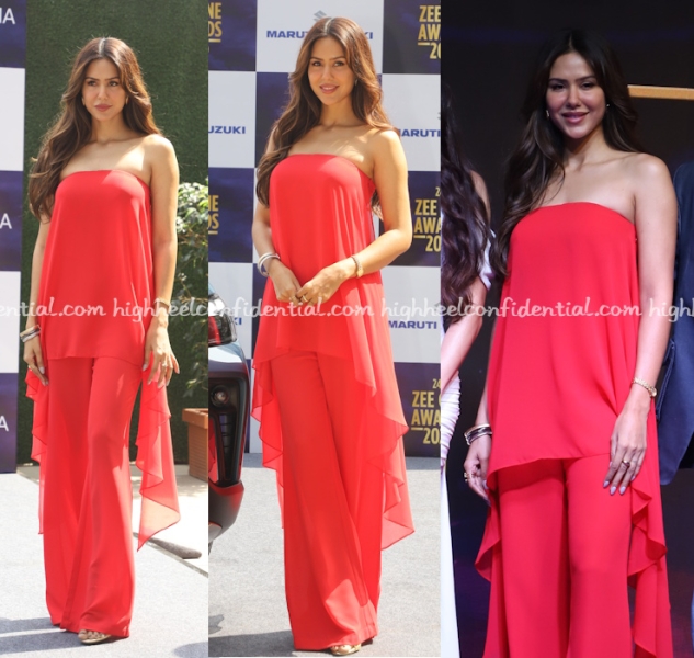 Sonam attended a press meet for an upcoming awards event wearing a strapless top and pants set from GDDB (Girls Don’t Dress For Boys). Sonam likes to keep it simple and that was the case here as well. She looked nice.