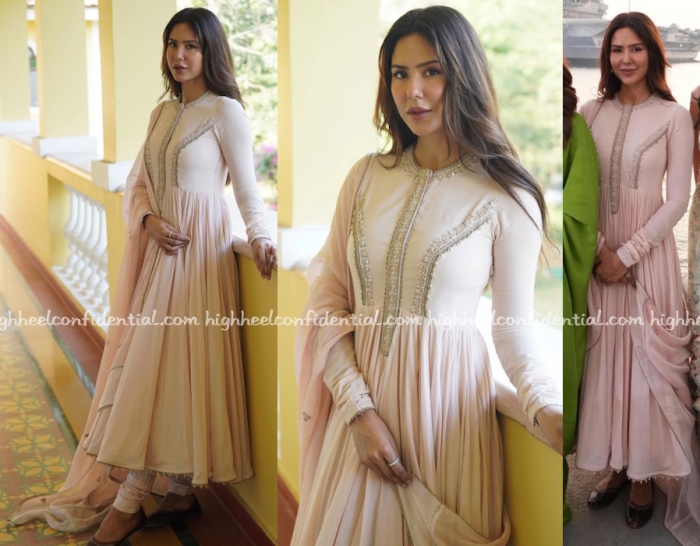 Wearing an pale pink anarkali from Priyancka Singh, Sonam attended the song unveiling of her upcoming movie. The anarkali had a muted vibe and she looked lovely in it.