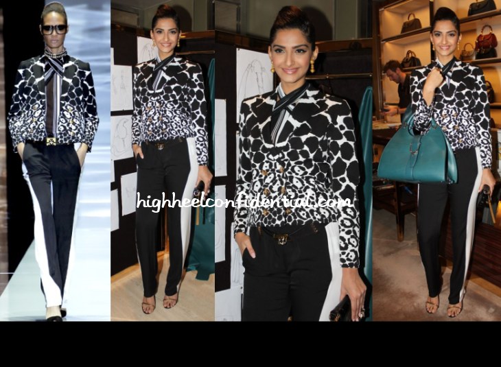 she should stop dressing always like a runway model. the model looks less cluttered than her & is carrying the look better (her pumps suit the look rather than sonams sandals).