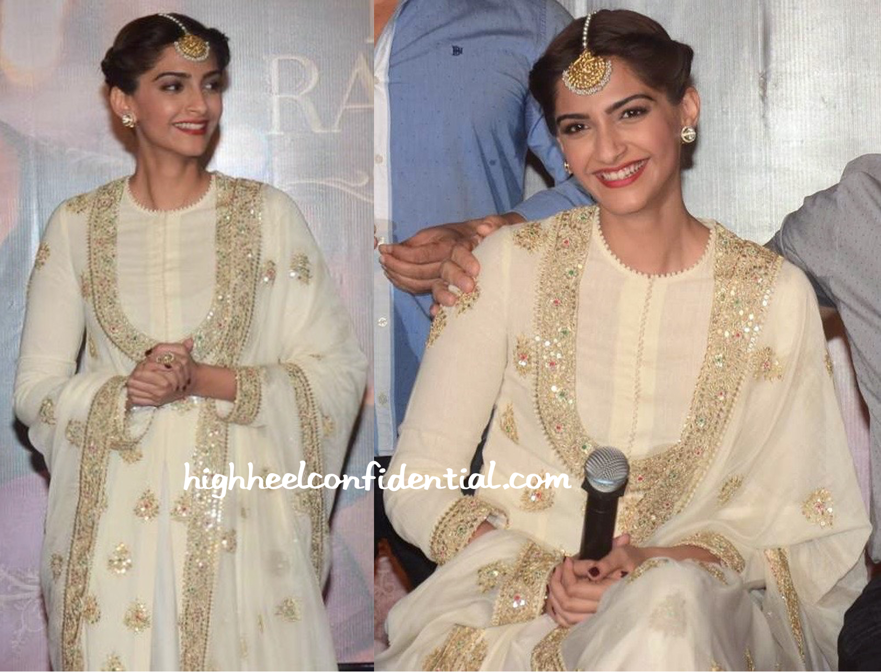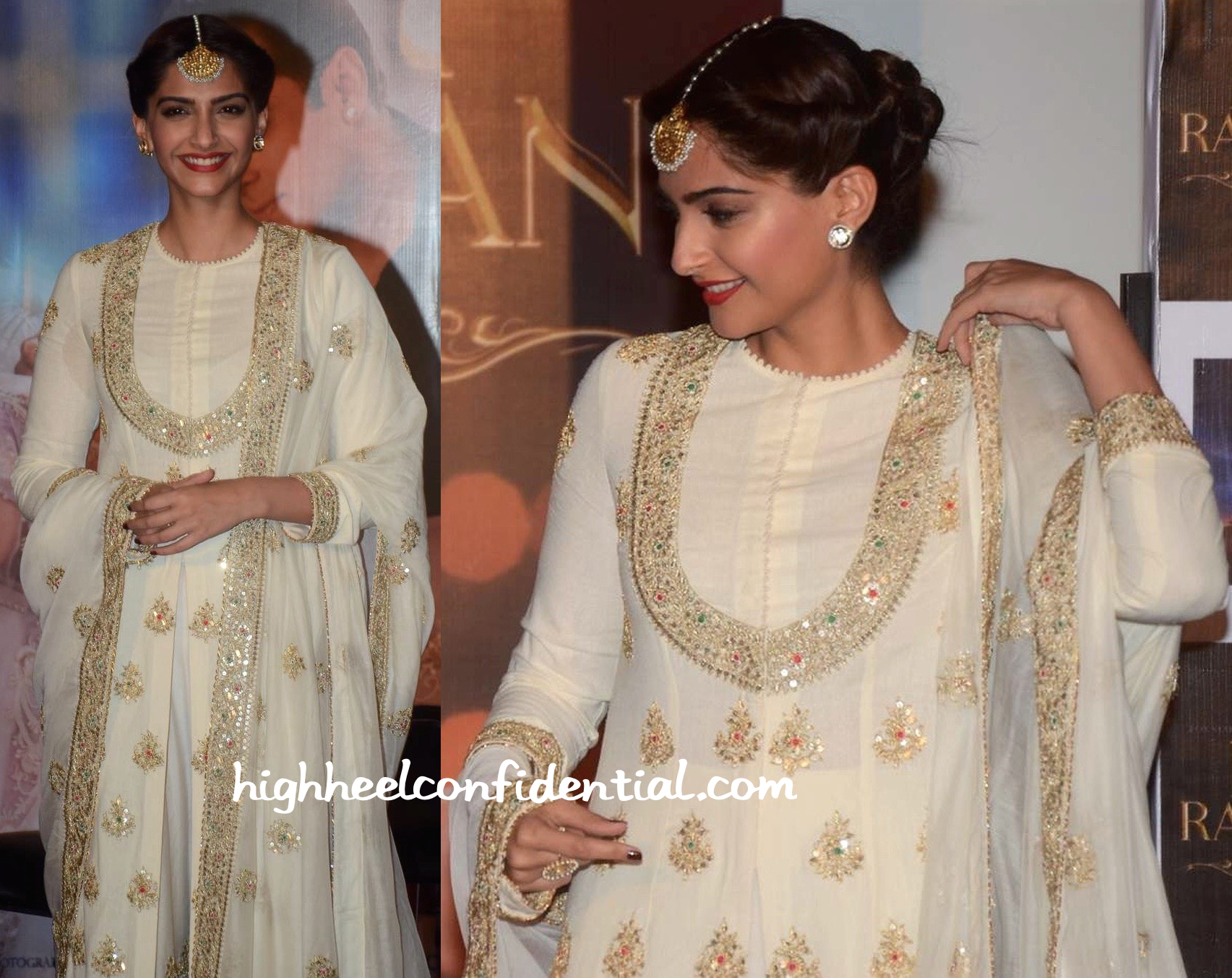 At the trailer launch of her upcoming movie, Sonam was photographed in an ivory Anamika Khanna. Wearing her hair up, the actor finished out the look with traditional jewelry and matching jootis. She looked lovely!