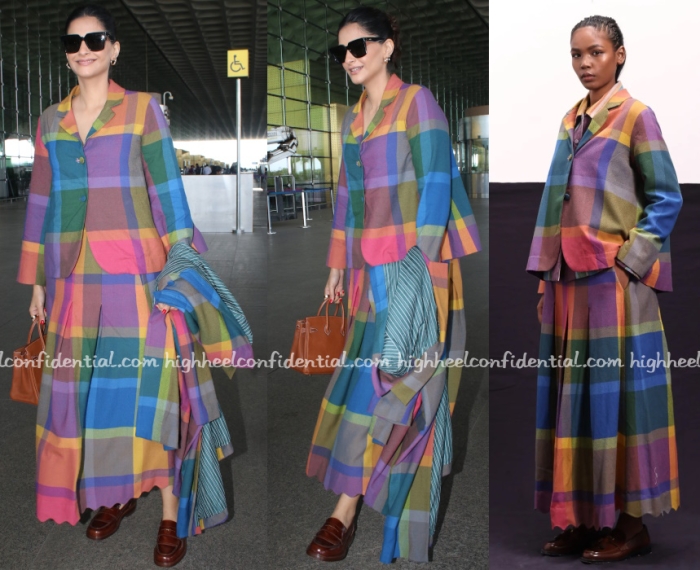 Wearing a wool jacket and skirt set from Ekà featuring the madras check pattern, Sonam jetted out of the city on Friday morning. Given the top was a buttoned up jacket, the buttoned coat on the hand felt overkill to me.