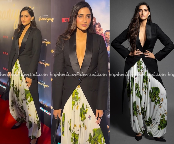 At the screening of her cousin’s movie, Sonam was seen in a jacket and floral harem pants from Loewe paired with pumps and a black bag. Now, this was an outing I really liked. Simple and effective.