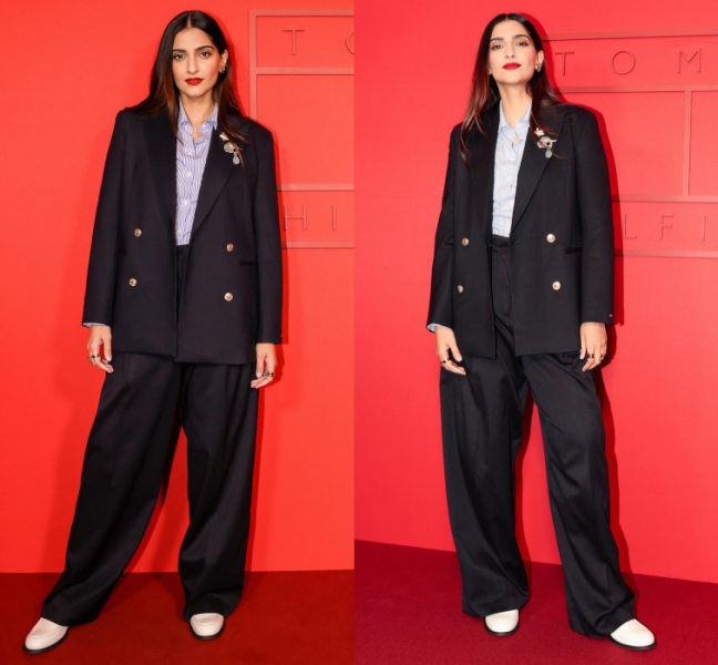 Sonam also attended the Tommy Hilfiger fashion show in New York wearing a pantsuit to the event. She looked nice in the business casual look. See it inside.