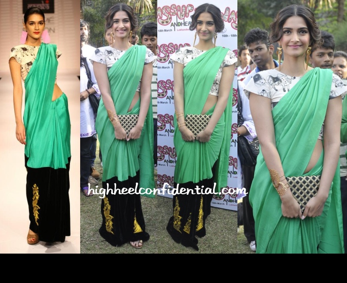 The model wears it better than Sonam. And her hair and make-up are awful. Wish Sonam would stop trying to kill the saree.