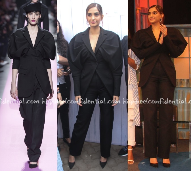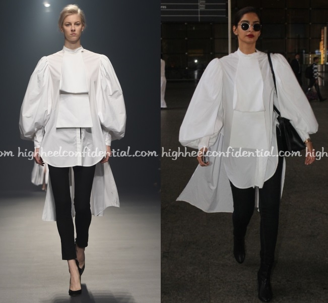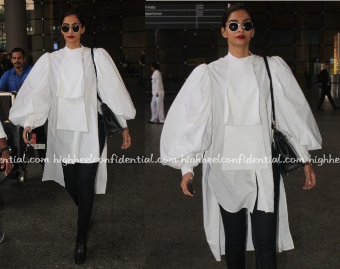Really like the outfit she has on at the airport, love the sleeves and the details of the shirt. I think Sonam makes a striking figure, accessories and styling complimenting the look. I love Jacquemus, just not this one on her.