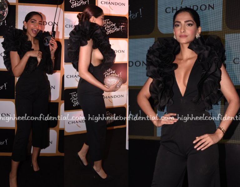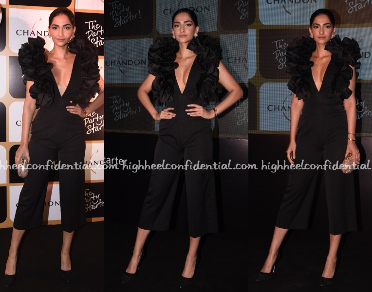 At an event unveiling a party anthem by a liquor brand, Sonam was seen in a black ruffle jumpsuit by Russian label, Rasario. Waist up, I loved this look. The ruffles, the plunging neckline and her hair and make-up. Waist down though, I wasn’t feeling the same way. The cropped length seemed to throw off proportions here and the jumpsuit didn’t seem to fall right either.