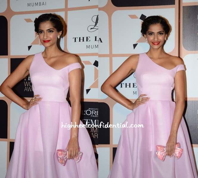 Unlike Katrina, Sonam who normally gives us a risky look every now and then, fell back to a basic one at the Femina Women Awards in a Toni Maticevski gown. Her pretty in pink look was finished out with a jewelled Leiber minaudiere and a chic updo.