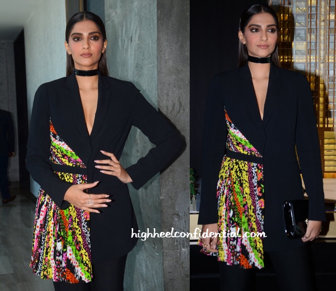 At the launch of Versace Home, Sonam was seen in a Resort 2016 blazer but instead of wearing it as it was showcased in the lookbook, she paired it with a pair of black cigarette pants. Accessories from the label and a sleek middle-parted do finished out her look.