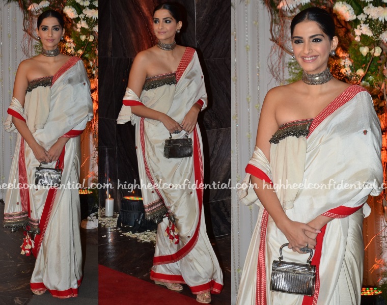 Sonam attended Bipasha and Karan’s wedding reception on Saturday evening wearing a Nikasha sari look fresh off the AIFW runway. When it came to the finishing touches, Ms. Kapoor got it absolutely right and I will also add, looked great.