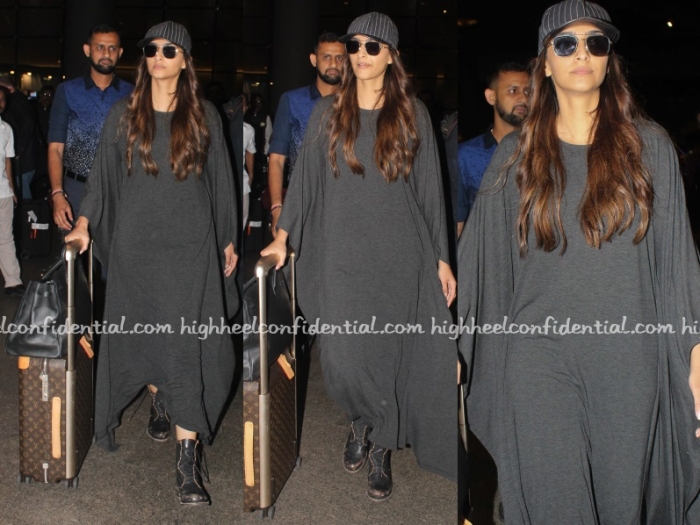 Wearing a jersey kaftan from her own line Rheson, Sonam arrived back in Mumbai on Monday evening after completing shooting for Veere Di Wedding in Phuket.