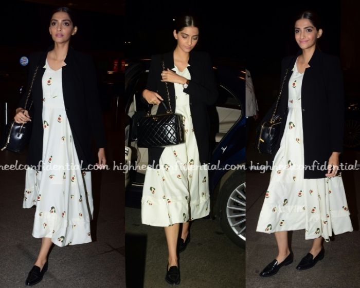 Wearing an avocado print dress from Rheson paired with a black blazer and black Chanel bag, Sonam jetted out of the city on Thursday evening.