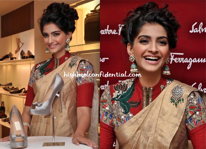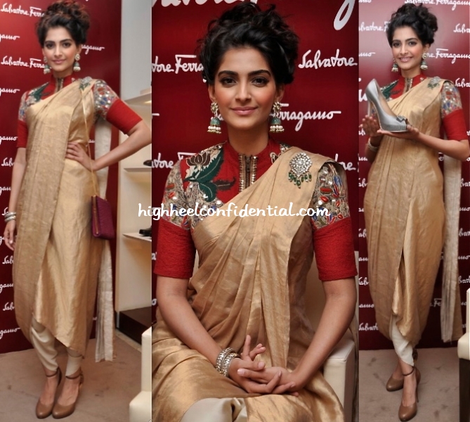To unveil her customized pair o’ Ferragamos, Sonam Kapoor picked an Anamamika Khanna draped sari-pants look. And minus the generous use of bronzer, I loved this look. She wears it so well!