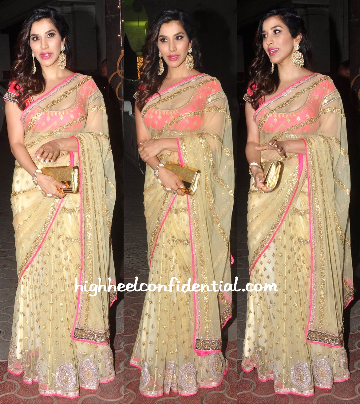Wearing a pink and pale-gold Nidhi Tolia lehenga sari, Sophie attended a Diwali soirée held last evening. Side-swept hair, pink lip, pair of chandbaalis (from Anmol) and a matching metallic clutch finished out the look. Sophie looked nice!