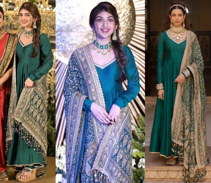 Sreeleela wore a green anarkali from Anjana Bohra to the Mandanna-Devarakonda wedding pairing it with gold and emerald jhumkis and necklace set. She looked nice in it.