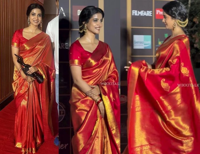 Gouri picked up a Filmfare Award for her Tamil movie in Kochi and was seen wearing a red jewelled tone kanjivaram paired with a short sleeve blouse and gold earrings that had hair chains. She looked absolutely lovely in it.