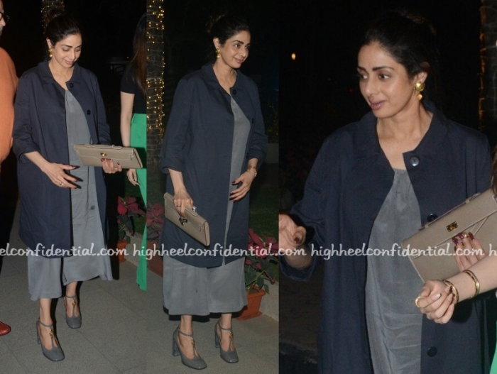 Sridevi attended the anniversary brunch party of a local salon on Sunday wearing a paisley print Chloe dress with Stuart Weitzman pumps and her Hermes clutch. She was also spotted at dinner later (see inside) in the evening with her family but while her accessories were the same, she switched out her clothes.